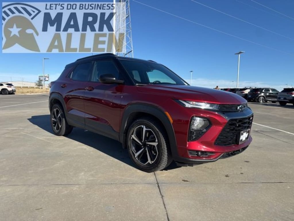 **LET'S DO BUSINESS OKLAHOMA! MARK ALLEN CHEVROLET, WHERE YOU ARE MORE LIKE FAMILY, THAN JUST ANOTHER CUSTOMER!** Recent Arrival!2022 Chevrolet TrailBlazer RS Clean CARFAX.29/33 City/Highway MPG** LOCAL TRADE IN **, **CERTIFIED BY CARFAX NO ACCIDENTS**, TrailBlazer RS, 4D Sport Utility, 1.3L Ecotec Turbo DOHC SIDI w/VVT, CVT, FWD, Crimson Metallic, Jet Black With Red Accents Cloth, 6 Speakers, 6-Speaker Audio System Feature, ABS brakes, Auto High-beam Headlights, Delay-off headlights, Dual front impact airbags, Dual front side impact airbags, Emergency communication system: OnStar and Chevrolet connected services capable, Exterior Parking Camera Rear, Front & Rear All-Weather Floor Liners (LPO), Front anti-roll bar, Front fog lights, Front wheel independent suspension, Heated Steering Wheel, Knee airbag, Low tire pressure warning, Occupant sensing airbag, Power driver seat, Power steering, Power windows, Preferred Equipment Group 1RS, Premium Carpeted Floor Mats, Radio data system, Radio: Chevrolet Infotainment 3 System, Rear Park Assist, Remote keyless entry, Ride & Handling Suspension, Steering wheel mounted audio controls, Traction control, Winter/Summer Floor Mat Package (LPO), Wireless Apple CarPlay/Android Auto.Awards:* 2022 IIHS Top Safety Pick+**Mark Allen Chevrolet**, LOCATED AT 16837 S US 75 HWY, GLENPOOL OKLAHOMA, 74033. LET'S DO BUSINESS OKLAHOMA!** PHONE # 918-227-1070.