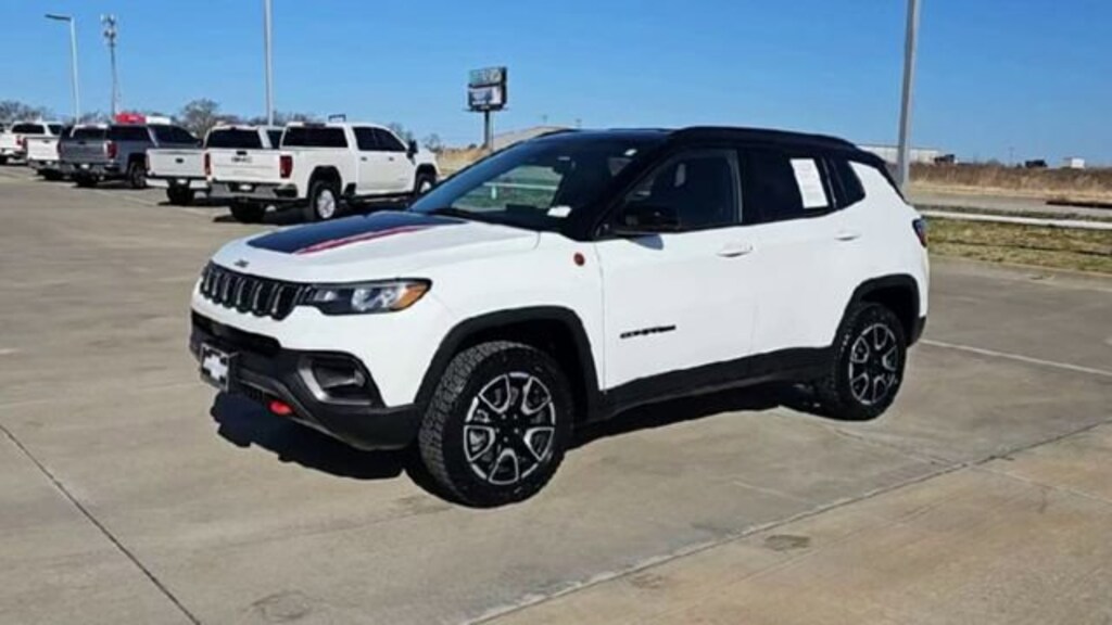 **CERTIFIED BY CARFAX NO ACCIDENTS**, Compass Trailhawk, 4D Sport Utility, 2.0L I4 DOHC, 8-Speed Automatic, 4WD, Bright White Clearcoat, Ruby Red/Black Cloth, 10.1 Touchscreen Display, 4G LTE Wi-Fi Hot Spot, 6 Speakers, Air Conditioning, Alloy wheels, AM/FM radio: SiriusXM, Automatic temperature control, Driver door bin, Driver vanity mirror, Dual front impact airbags, Dual front side impact airbags, For Details, Visit DriveUconnect.com, Four wheel independent suspension, Front Center Armrest w/Storage, Front dual zone A/C, Front reading lights, Global Telematics Box Module (TBM), Knee airbag, Leather Shift Knob, Leather steering wheel, Low tire pressure warning, Occupant sensing airbag, Outside temperature display, Overhead airbag, Overhead console, Passenger door bin, Passenger vanity mirror, Power steering, Power windows, Premium Cloth/Leather Trim Bucket Seats, Quick Order Package 29E, Radio: Uconnect 5 w/10.1 Display, Rear anti-roll bar, Rear seat center armrest, Rear window defroster, Rear window wiper, Remote keyless entry, SiriusXM Guardian - Included Trial (B), SiriusXM Radio Service, Steering wheel mounted audio controls, Tachometer, Telescoping steering wheel, Tilt steering wheel, Traction control, Variably intermittent wipers, Wheels: 17 x 6.5 Painted Black Aluminum.